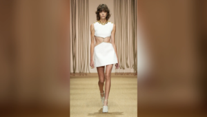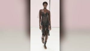 We began with airy drop-waist dresses, adorned with Art Deco motifs and pearl-trimmed botanical reliefs. While there were some fringed hems, these weren’t retro flapper pieces. Instead, Jones pared down the shapes and modernized the necklines, giving them a ’90s slip dress vibe or even a touch of sportswear influence.