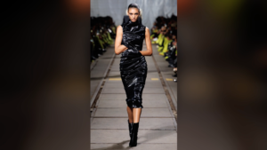 The transition of leadership at McQueen commenced with a woman elegantly draped in glossy black laminated jersey. One arm was gracefully pinned across her breast, while the other remained discreetly tucked inside her skirt. Seán McGirr drew inspiration from Lee McQueen’s iconic spring ’95 collection, particularly the moment when a model was encased in transparent pallet tape.