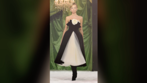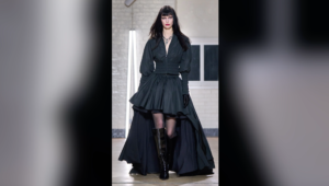 A grand Georgian façade, faux railings, Richard Quinn engraved above the door like it’s always been there. A fantasy in bricks and mortar. This winter’s set wasn’t just escapism—it was a scene. “It’s after midnight, the end of a private black-tie party,” Quinn explained, setting the tone like a director calling action. “Maybe it’s a pre-wedding dinner, maybe it’s the day after—and the guests are leaving. It’s snowing. The moon is up.”
