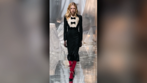 Seán McGirr’s second collection for Alexander McQueen opened with a sharply tailored suit, its lapels rolled together at the chest, as if bracing against an unexpected London downpour—or perhaps a metaphorical storm from critics. McGirr faced heavy scrutiny after his debut last season, stepping into the shoes of Sarah Burton, who had not only been Lee Alexander McQueen’s right hand but had led the brand with great success for over a decade. The Irish designer’s introduction was bound to be difficult, and the choice of a remote warehouse in Paris for his first show, combined with a chilly, rainy journey, didn’t help win him immediate favor.