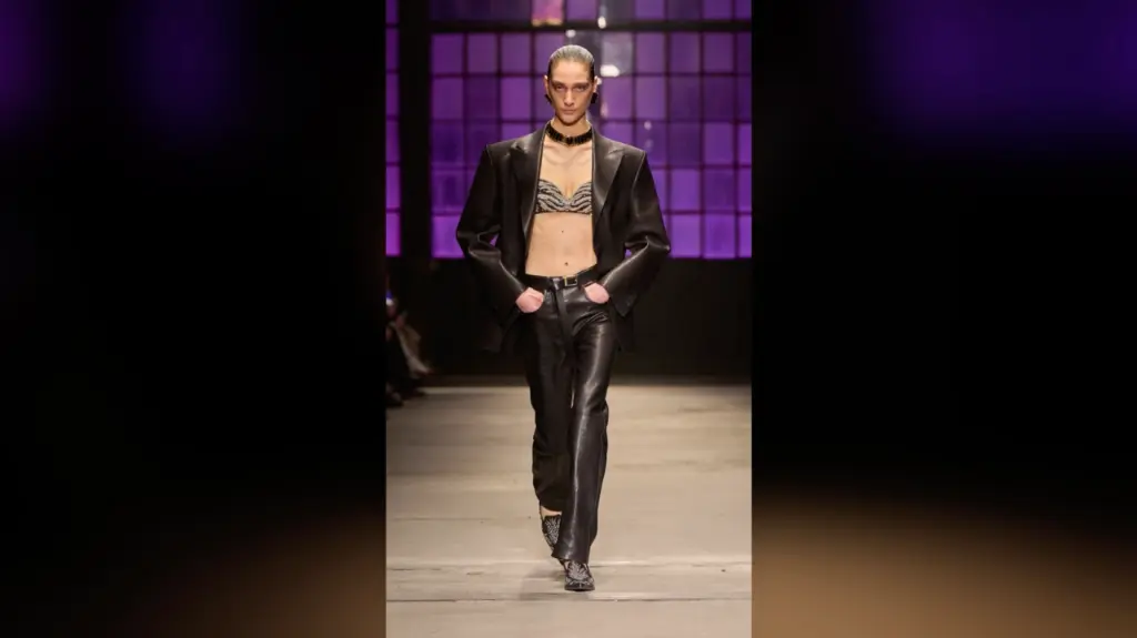 The opening black leather pantsuit set the tone. Boyish cut. Clean. Paired with a spangled bra top that still winked at Cavalli’s DNA. Then came an A-line tutu skirt—a callback to Puglisi’s early days—styled with pointy loafers. Loafers. On a Cavalli runway. That alone told you the fantasy had shifted. There was also a cocktail look barely more substantial than a leotard, its neckline nodding to Princess Diana’s revenge dress energy. Not literal—but that same sharp, post-breakup clarity.